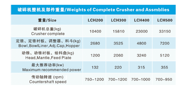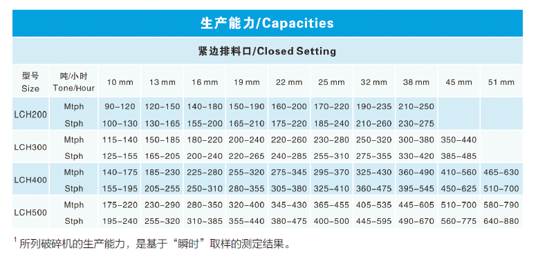 生產(chǎn)能力表可作為LCH 圓錐破碎機初步選型的工具,表中數(shù)據(jù)適用于松散密度1.6t/m3 的給料、給料中篩出小于排礦口粒級、開路作業(yè)條件下的生產(chǎn)能力。在給料中細(xì)粒級含量較高、閉路作業(yè)條件下,設(shè)備能力比開路作業(yè)高15%- 30%。破碎機作為生產(chǎn)回路中的一個重要組成部分,其性能的發(fā)揮部分取決于給料機、皮帶機、振動篩、支撐結(jié)構(gòu)、電動機、傳動裝置及料倉等輔件的正確選擇和操作。